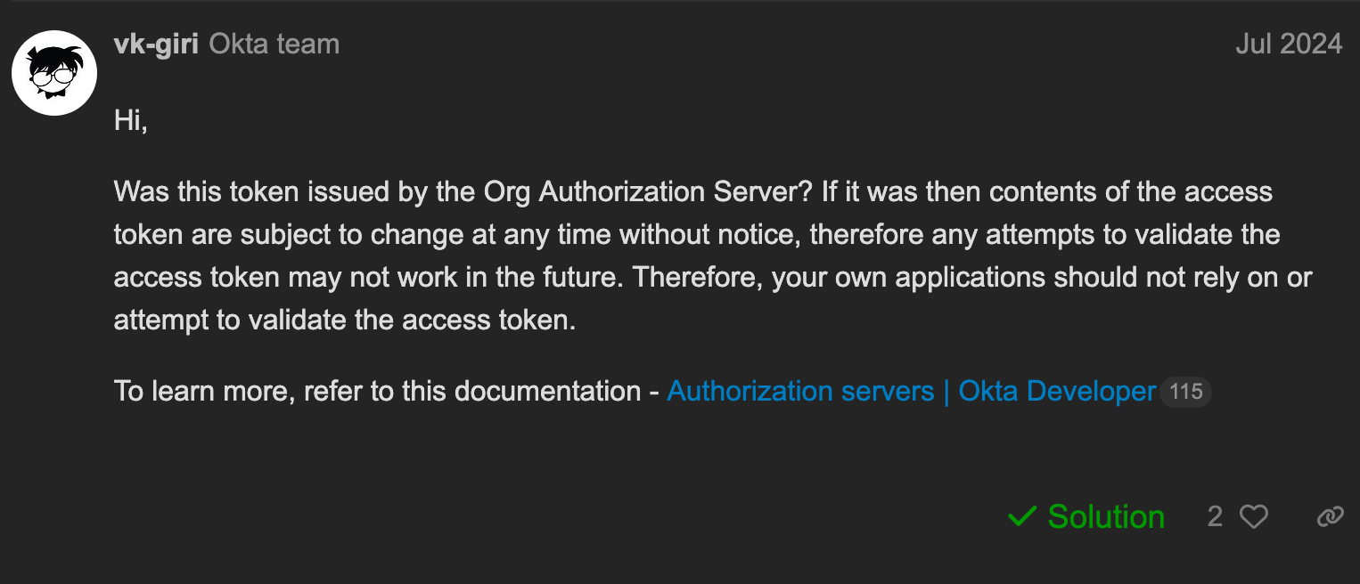 An error occurred while attempting to decode the Jwt: JOSE header typ (type) application/okta-internal-at+jwt not allowed